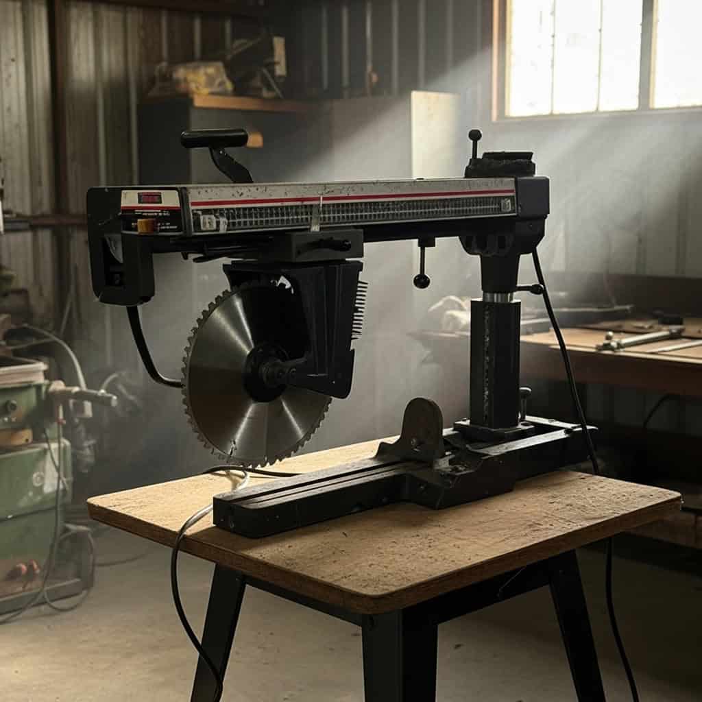 The radial arm saw sat in the corner like a sleeping dragon—heavy, awkward, and capable of yanking itself toward you if you weren’t paying attention.