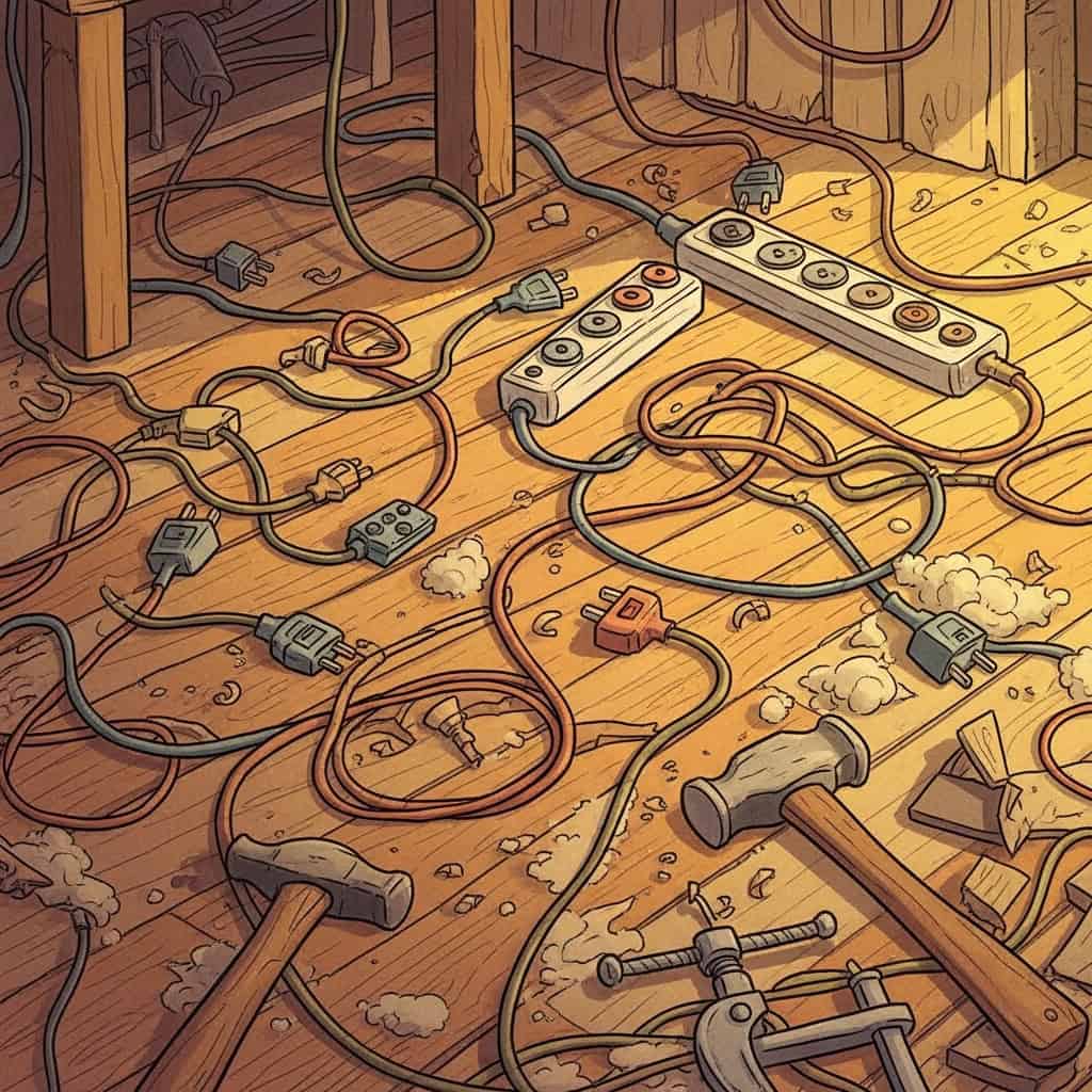 7. Extension Cords Daisy-Chained Across the Shop Like Christmas Lights