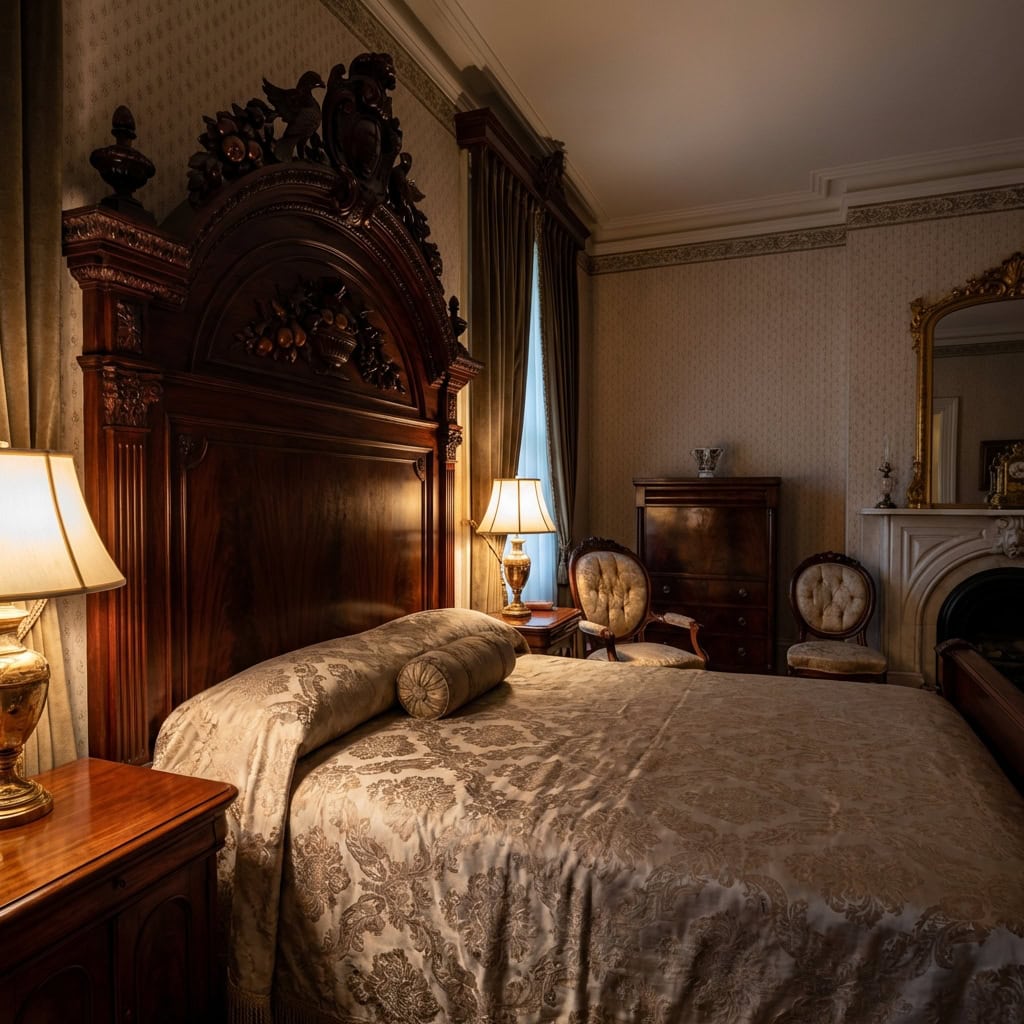 The chair is a Victorian-era parlor chair — dark wood, carved details, upholstered in period fabric. It is not as dramatic as the Lincoln Bed, and it does not carry the same mythology. But it is authentic to the Lincoln administration in a way that the bed, ironically, is not.