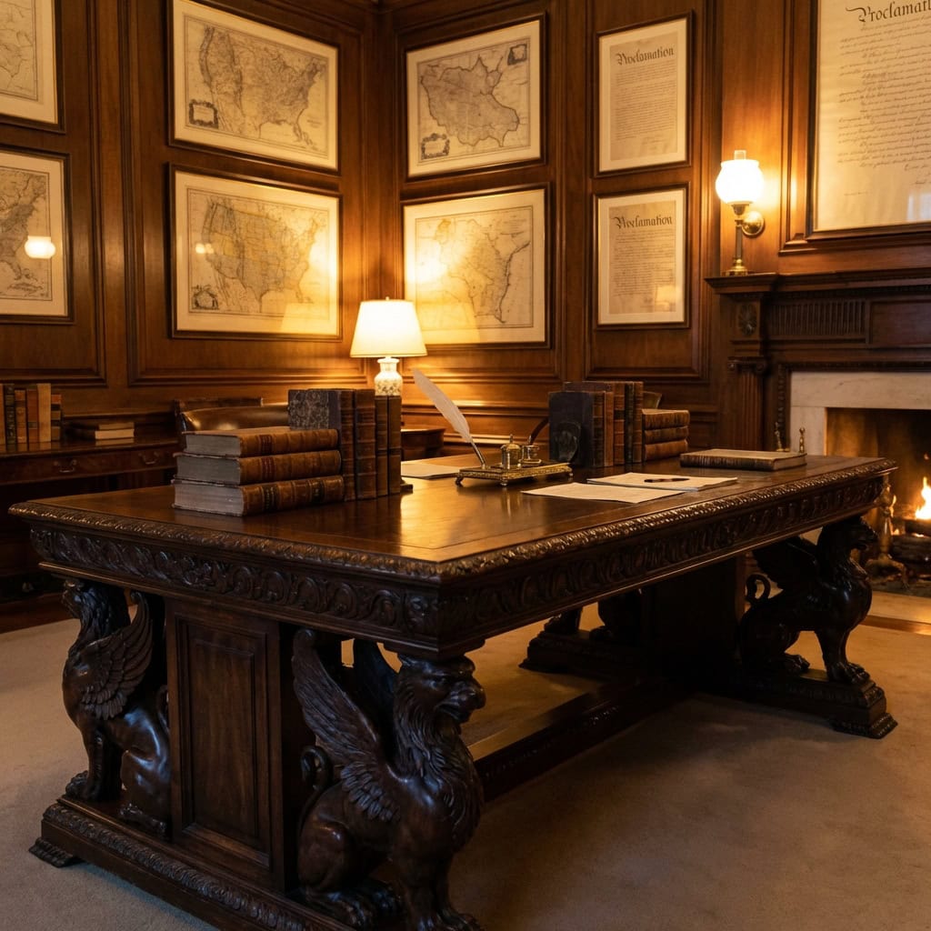 The table is a large, heavy, dark wood piece with ornate carved legs that reflects the late 19th-century taste for substantial, imposing furniture. It has served as both a working surface and a ceremonial one — the kind of table that makes whatever you sign on it feel permanent.