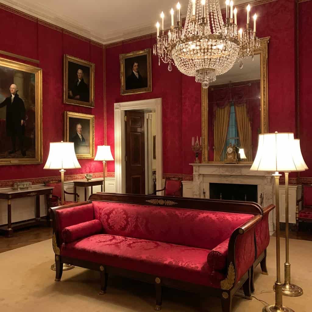 The Red Room is one of the most photographed rooms in the White House, and its centerpiece is a Federal-period Empire sofa that has survived more redecorations than almost any other piece of furniture in the building.