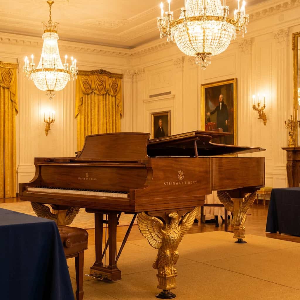 It sits in the East Room — the grand ceremonial space where concerts, press conferences, and state events are held. Every pianist who has performed at the White House in the last 85 years has played this instrument, including Van Cliburn, who performed for multiple presidents.