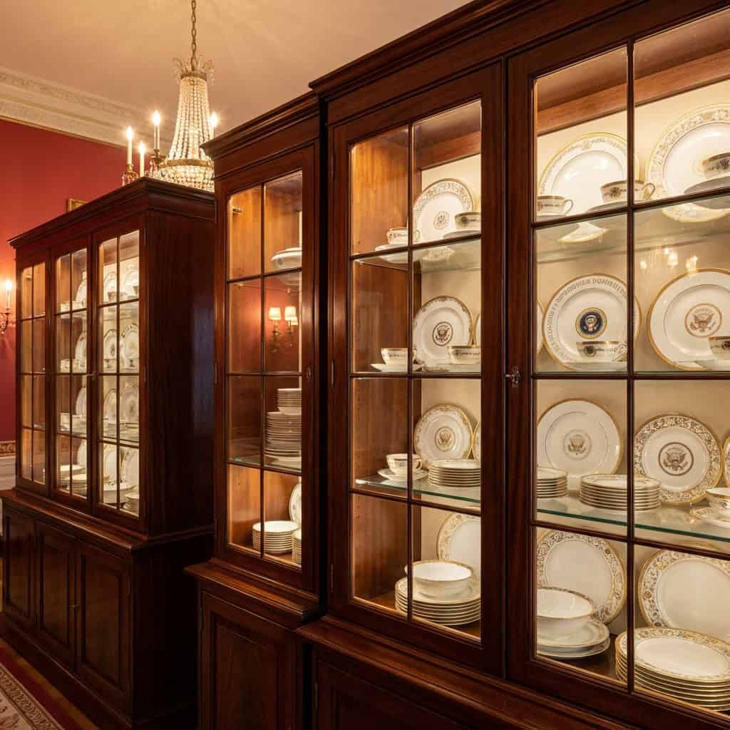 The room is lined with glass-fronted display cabinets that house place settings from nearly every administration. Each set of china reflects the taste of the president and first lady who commissioned it — from the simple elegance of Washington’s era to the elaborate custom designs of more recent administrations.