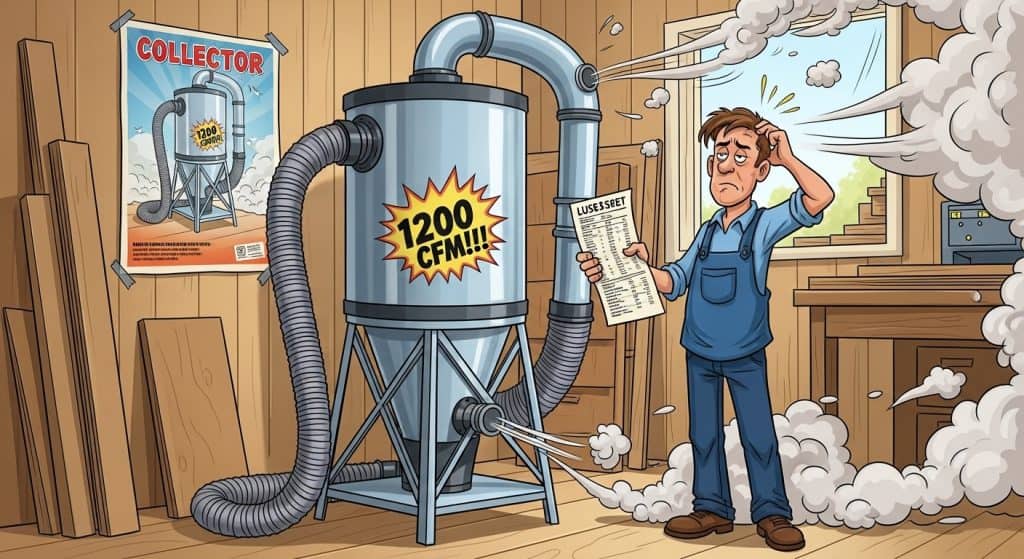Dust collector marketing can be misleading. When you see a spec sheet listing airflow at 1,200 CFM, that number was usually measured with no ducting, no filter, and no resistance—basically the motor spinning freely in open air.