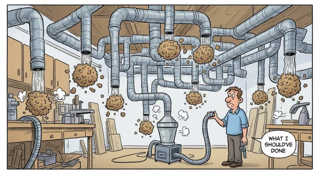 Early on, I used too many tight 90° elbows and long stretches of flex hose, and my collector’s performance dropped dramatically. Every bend and every ridge adds turbulence, which slows airflow and allows dust to settle.