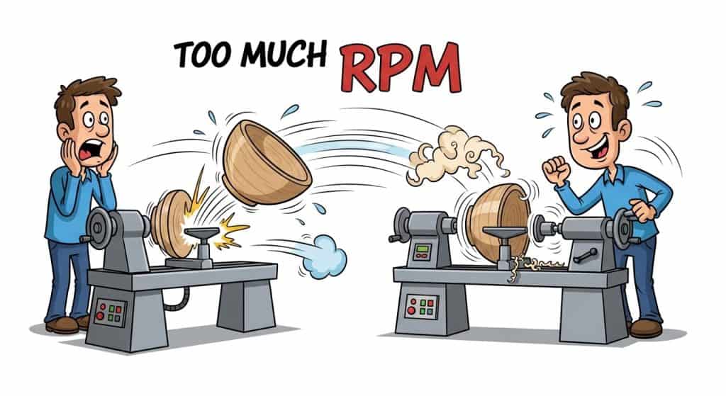A simple rule of thumb is to keep the diameter of your piece multiplied by RPM between 6,000 and 9,000. That means a 10-inch bowl should be turned at about 600 to 900 RPM, not thousands more.