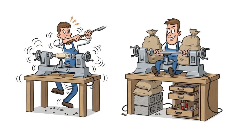 You can solve this by adding weight to your lathe stand with sandbags, concrete blocks, or storage drawers filled with heavy items.