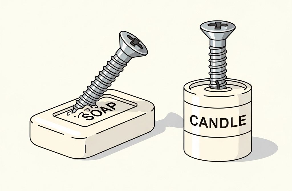 A quick rub of a screw on a candle or bar of soap makes it drive smoother and reduces the chance of splitting the wood. The same trick works for sticky wooden drawers.