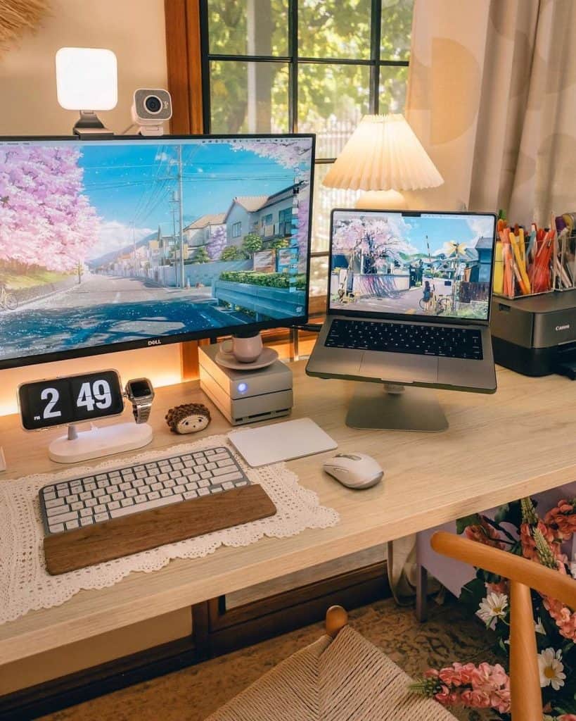 A cozy desk setup includes a large monitor and laptop displaying scenic backgrounds, a white keyboard and mouse, a digital clock, a lamp, and a variety of colorful pens, all arranged neatly by a window with a view of greenery.