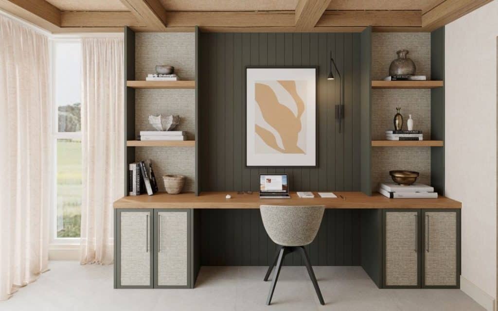 A modern home office design includes a dark green paneled accent wall, wooden desk with matching shelves, beige cabinetry, and a large window with soft curtains, providing a serene and functional workspace.
