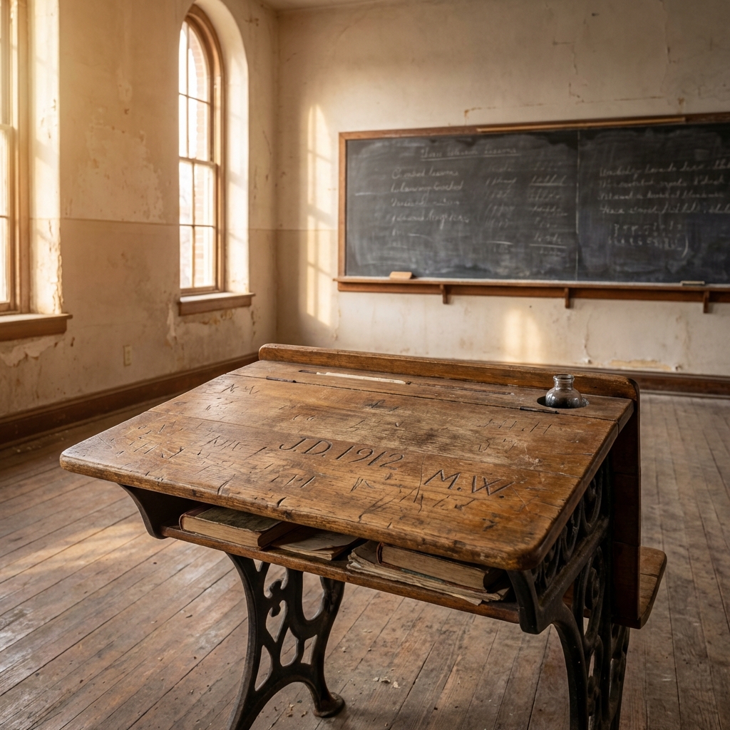 The desktops were scarred with decades of carved initials, doodles, and the occasional answer to a math test. The hinges creaked. The iron frames were indestructible.