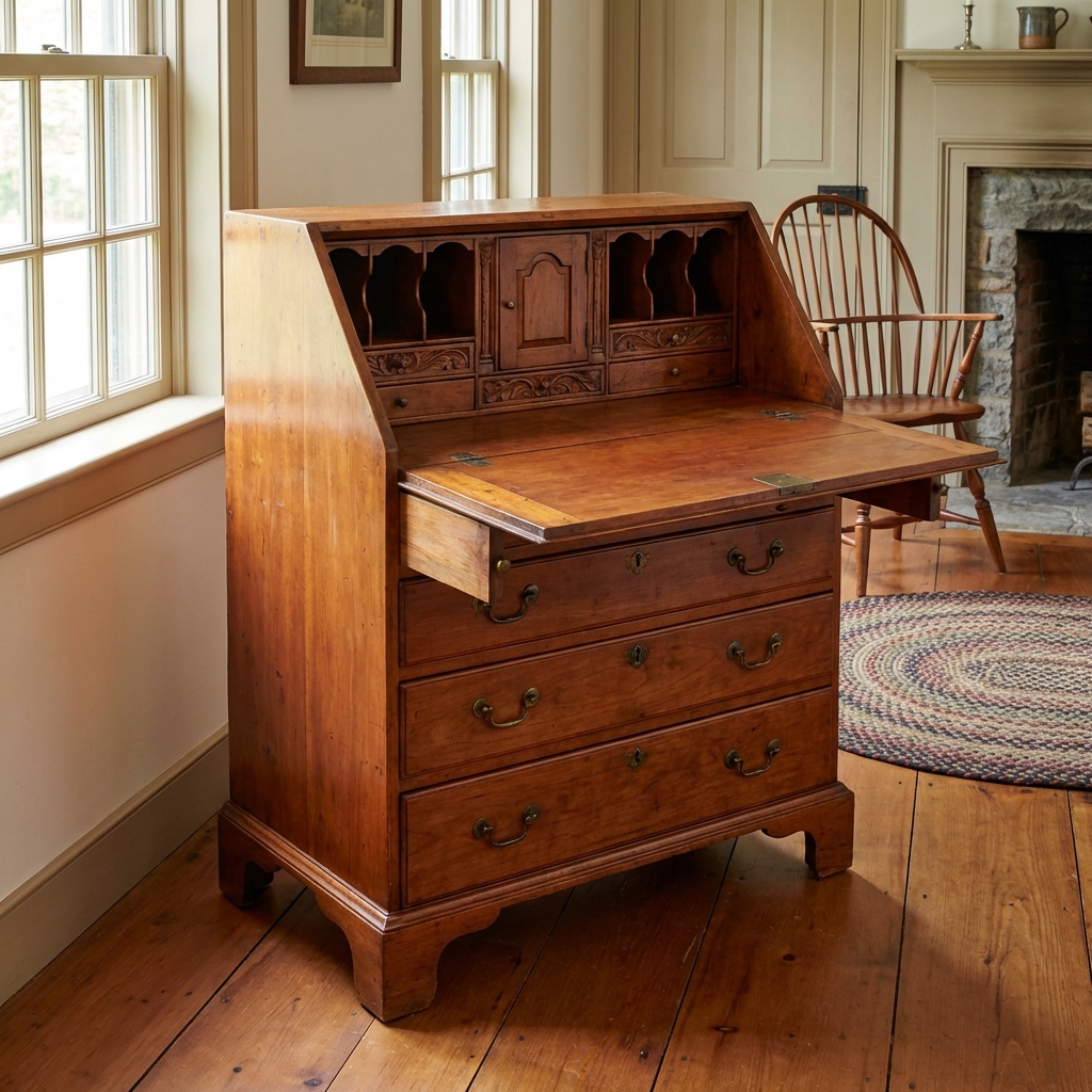 The slant-front desk was the workhorse of colonial and Federal-era America. Every founding father owned one. Every country lawyer had one. They were built in cherry, walnut, maple, and mahogany, and the joinery on the best examples is museum-quality.