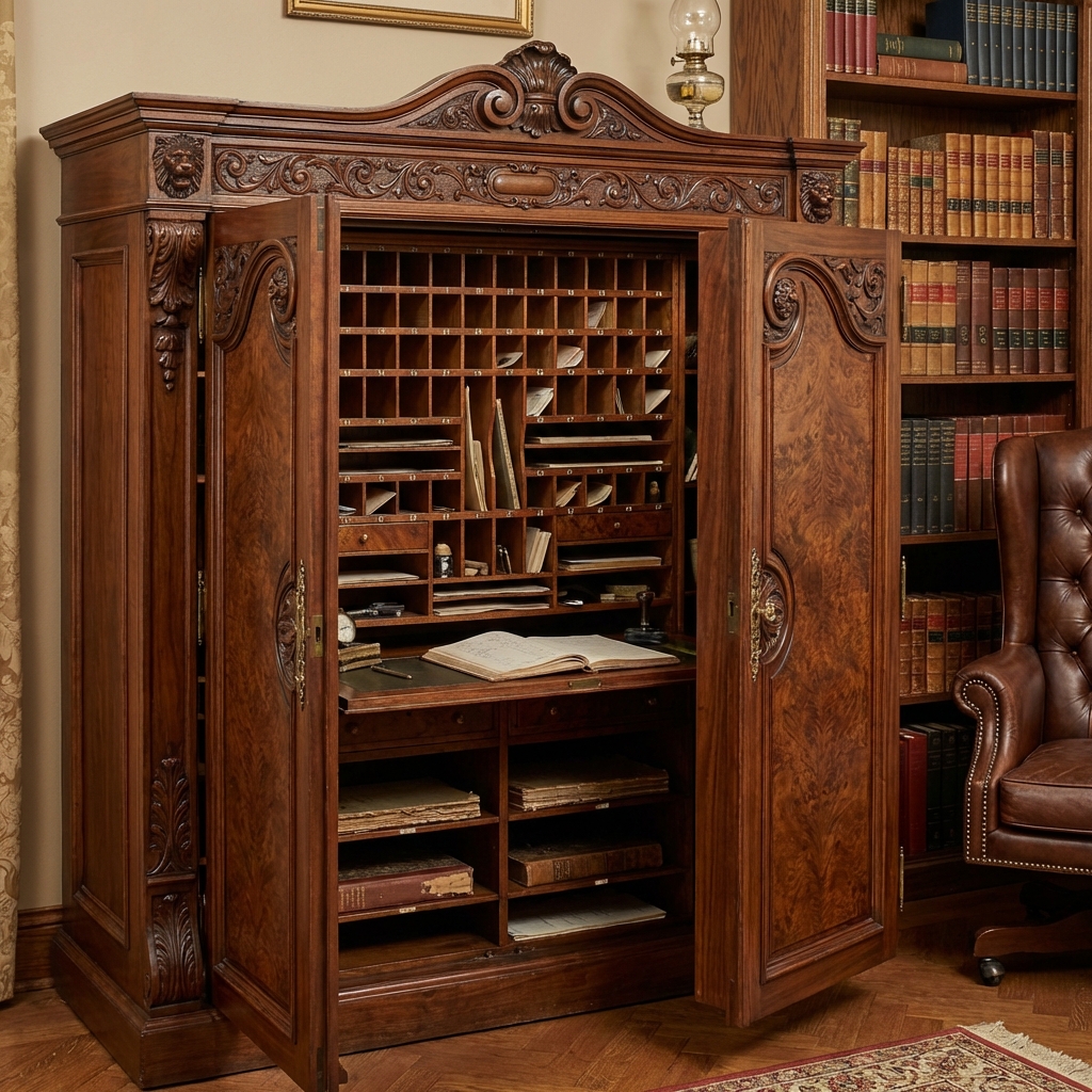 Patented by William S. Wooton of Indianapolis in 1874, it looked like an ornate Victorian cabinet when closed. But when you swung open the two massive hinged panels on either side, it revealed over 100 separate compartments — drawers, pigeonholes, letter slots, and cubbies — all surrounding a central writing surface.