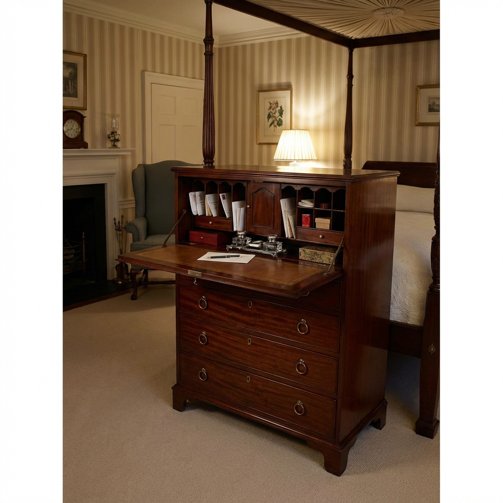 The butler’s desk was designed for homes that did not have a dedicated study or office. It gave you a full writing desk without taking up any additional space. The name comes from the theory that the household butler used it to manage household accounts — though in practice, anyone in the house could have used it.