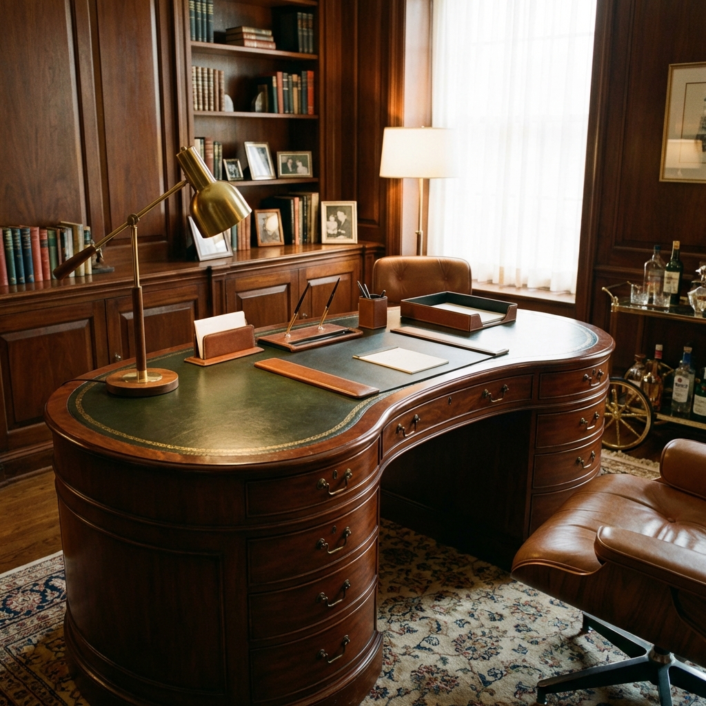The kidney desk — named for its curved, bean-shaped top — was the desk of old Hollywood, mid-century executive suites, and every library in every mansion you have ever seen in a movie.