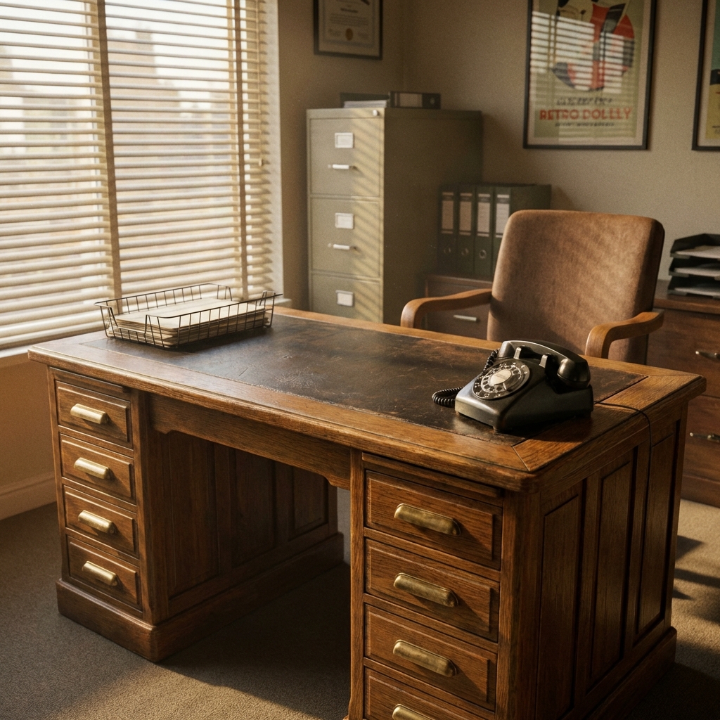 It was a large, flat-topped writing desk supported by two pedestals — each pedestal containing three or four drawers on the front, with a wide center drawer spanning the gap between them. The top was usually leather-inlaid. The construction was solid hardwood — oak, mahogany, or walnut — and the whole thing weighed enough to require serious effort to move.