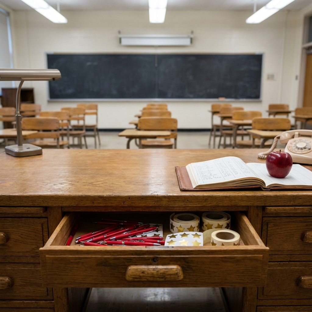 The center drawer was legendary. Confiscated notes, rubber bands, red pens, gold star stickers, and a wooden ruler that served double duty as a pointer and a gentle threat. Every student knew what was in that drawer, and every student knew not to open it.