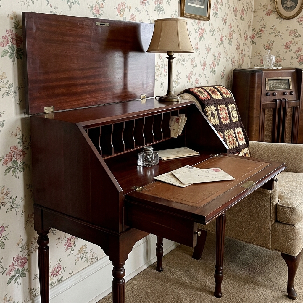 The name came from its resemblance to a spinet — a small piano or harpsichord. In fact, the earliest spinet desks were literally made from gutted spinet pianos whose strings had worn out. Furniture makers in the 1920s and 30s mass-produced them in mahogany and walnut, and they became a staple of American living rooms.