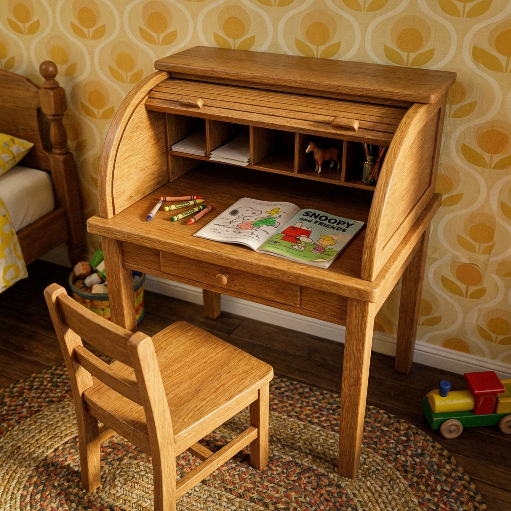 Some were beautifully made in solid oak or maple. Others were simpler — pine or even pressed wood — but they all had the same magic. Roll the top down and your homework disappeared. Roll it up and you were open for business.