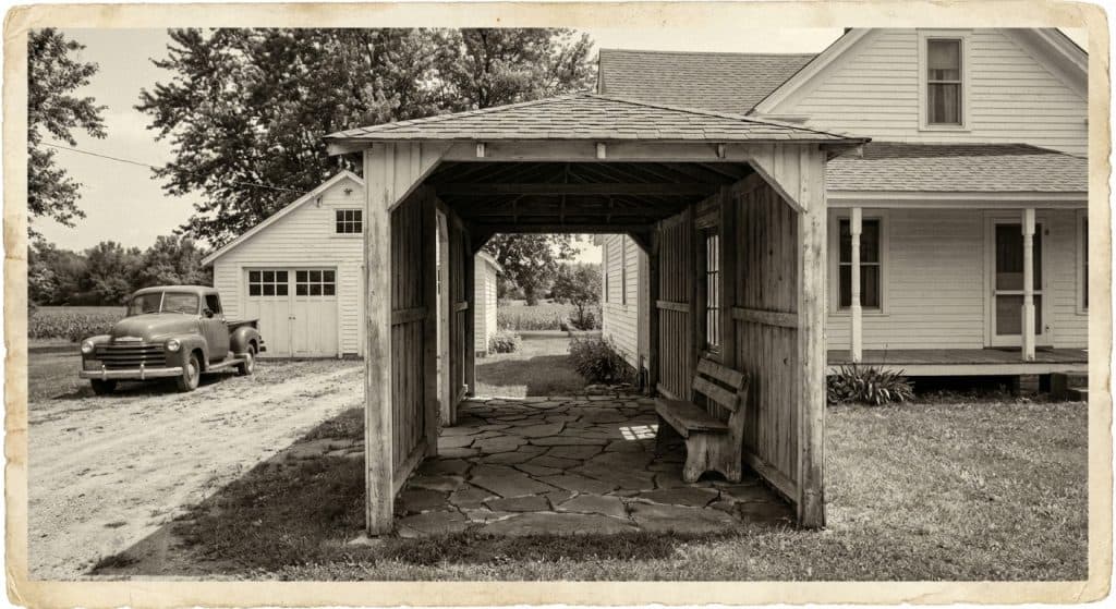 Originally built for horse-drawn carriages, it is a roofed structure extending from the side or front of the house over the driveway.