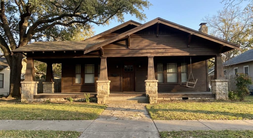 Low-pitched roof. Wide overhanging eaves. Tapered porch columns on stone pedestals. A front porch you could actually live on.