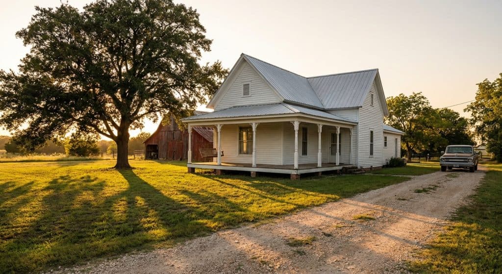 Simple gabled roof. Clapboard siding. A wide porch that wraps around one or two sides. A floor plan built for function, not for showing off.
