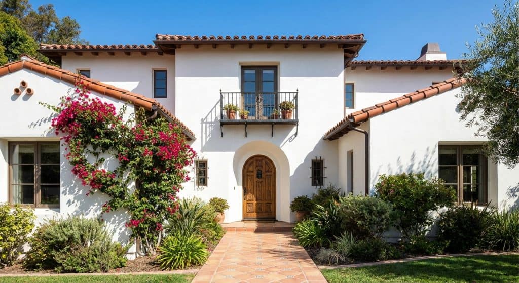 White stucco walls. Red clay tile roof. Arched doorways. Wrought iron details. Interior courtyards.