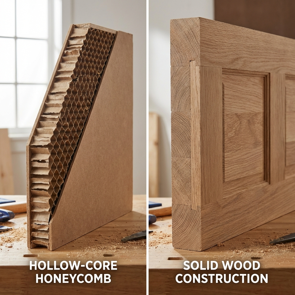A hollow-core door costs a builder about $30. A solid wood panel door costs $150 to $300. Multiply that by 15 doors in a house and you can see why builders made the switch.
