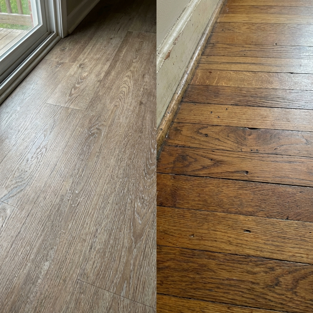 Older homes had real hardwood floors — oak, maple, or pine — nailed down board by board. Those floors could be sanded and refinished five or six times over their lifetime. Vinyl plank cannot be refinished at all. When it wears out, it goes in the dumpster.