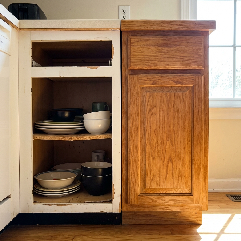 In most builder-grade kitchens, the cabinet boxes are made of particle board or melamine-coated MDF with a thin laminate veneer. The doors might look nice, but the structure holding everything together is essentially compressed sawdust.