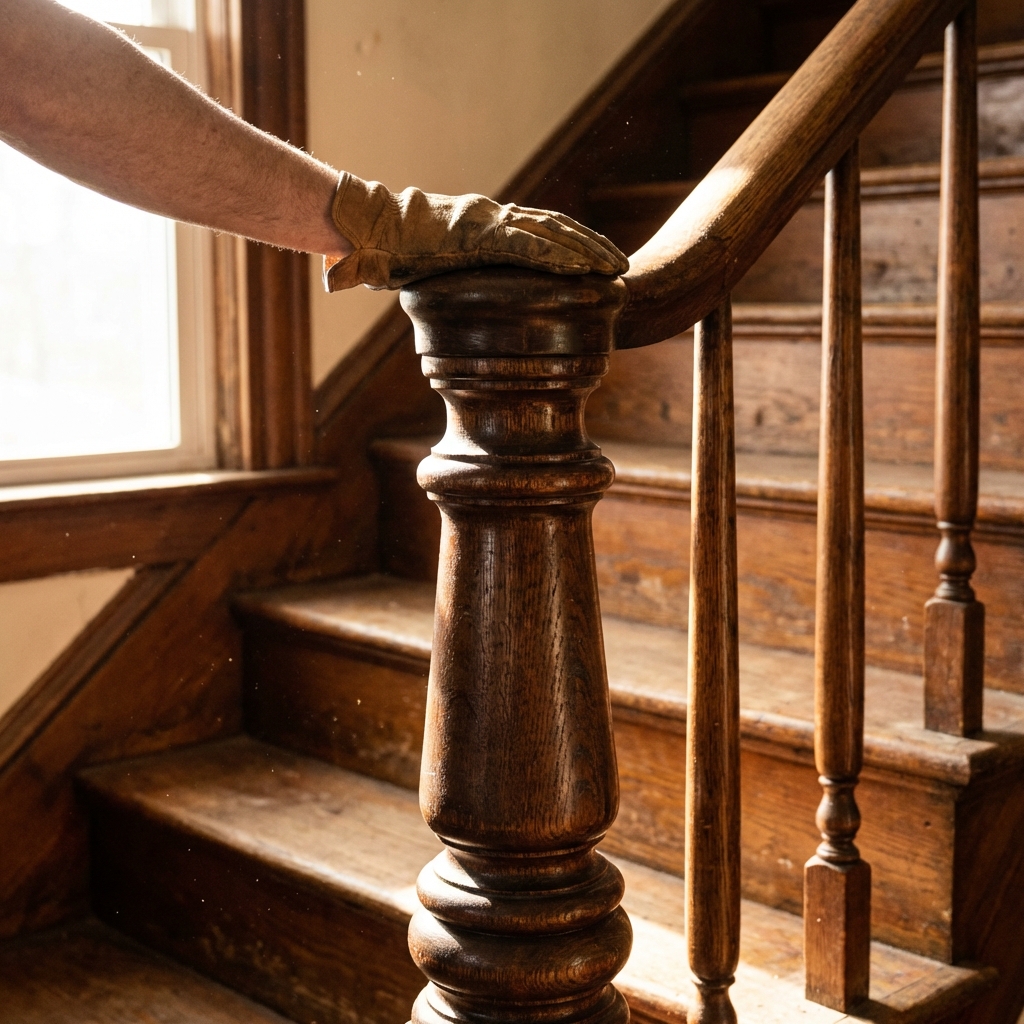 If it wobbles, it is hollow. Many modern stair components are hollow boxes wrapped in a veneer or paint-grade shell. They look right. They feel wrong.
