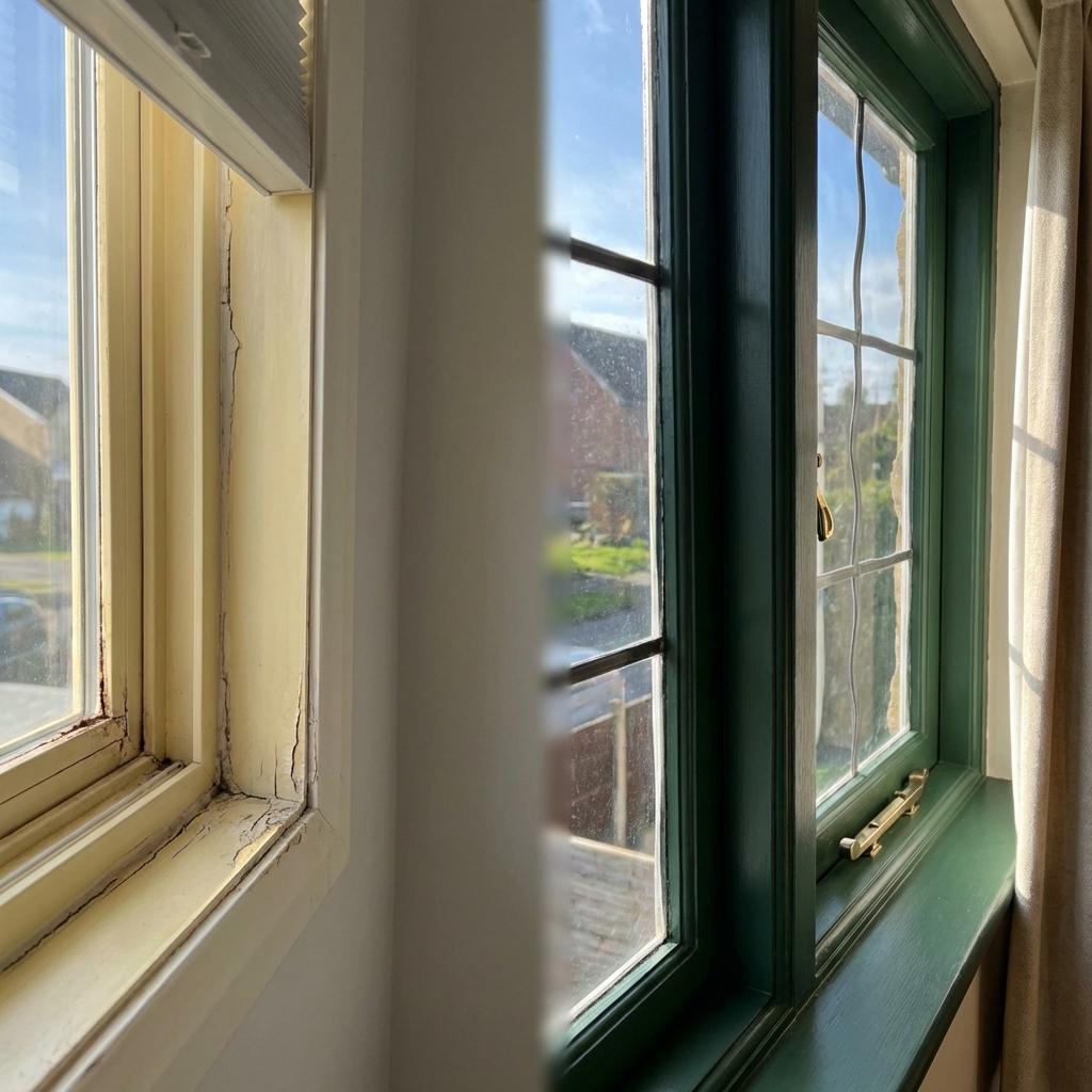 Older homes had real wood windows — usually double-hung with rope-and-pulley sash weights built into the wall cavity. They could be repaired indefinitely. A broken pane was a $5 fix. A rotted sill could be patched or replaced by anyone with basic carpentry skills.