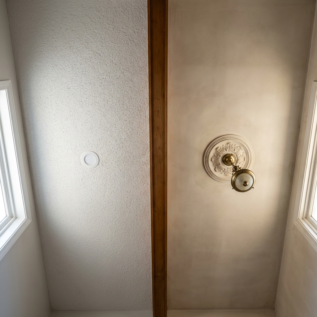 Older homes often had smooth plaster ceilings, sometimes with decorative medallions around the light fixtures. The craftsmanship overhead matched the craftsmanship at eye level.