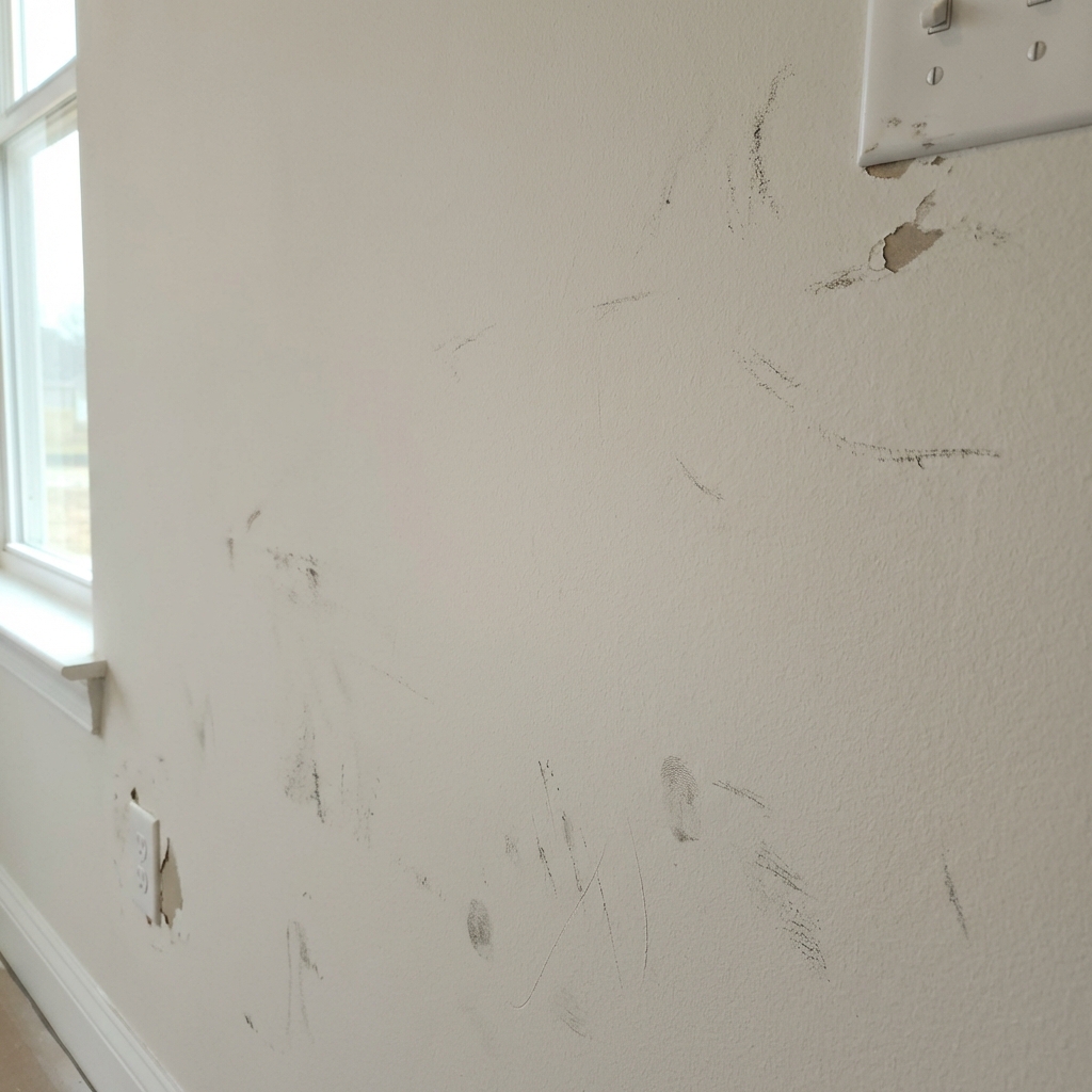 New construction homes are typically painted with one coat of the cheapest contractor-grade flat paint available. It covers. It is fast. And it starts showing scuffs, marks, and wear within months.