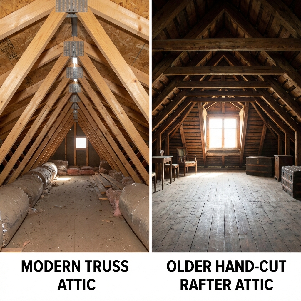Older homes used hand-cut rafters with a ridge board. This method left the attic wide open — a massive, usable space that many homeowners converted into rooms, offices, or storage.