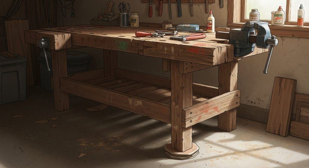 Grandpa’s workbench was made from whatever wood he had on hand—2x4s, old doors, maybe part of an old dresser. Nails bent into corners. The surface? Permanently stained with oil, paint, glue, and possibly coffee.