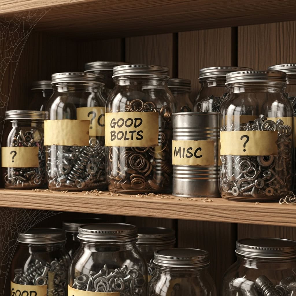 6. Mystery Jars With Handwritten Labels Like “Good Bolts” or “???”