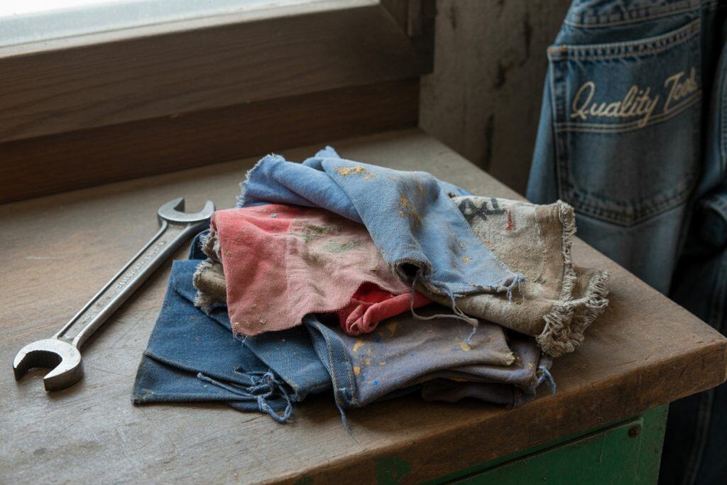 No fancy microfiber cloths here—just old cotton shirts, flannel scraps, and mystery fabric that had survived decades of abuse.