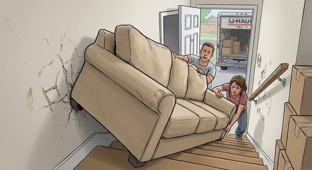 Moving heavy furniture up stairs without experience leads to damaged walls and damaged backs.