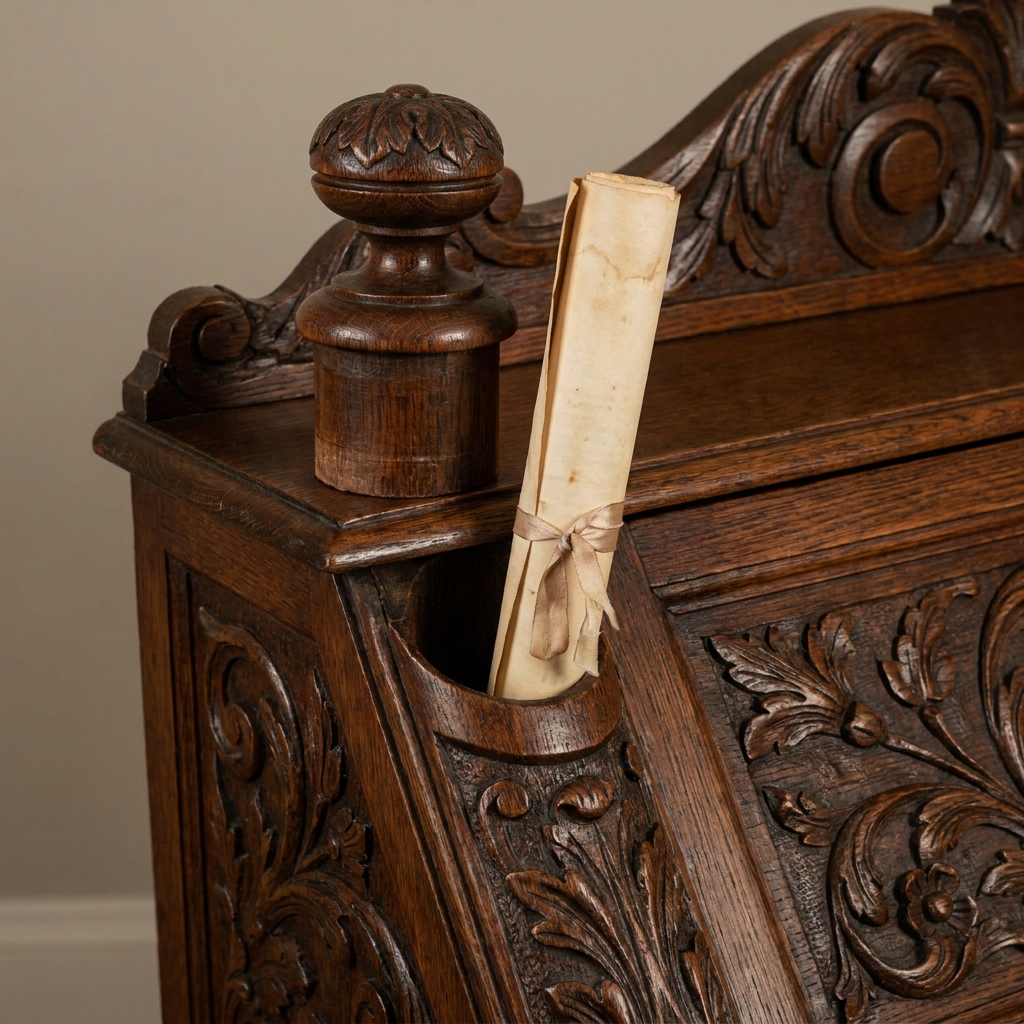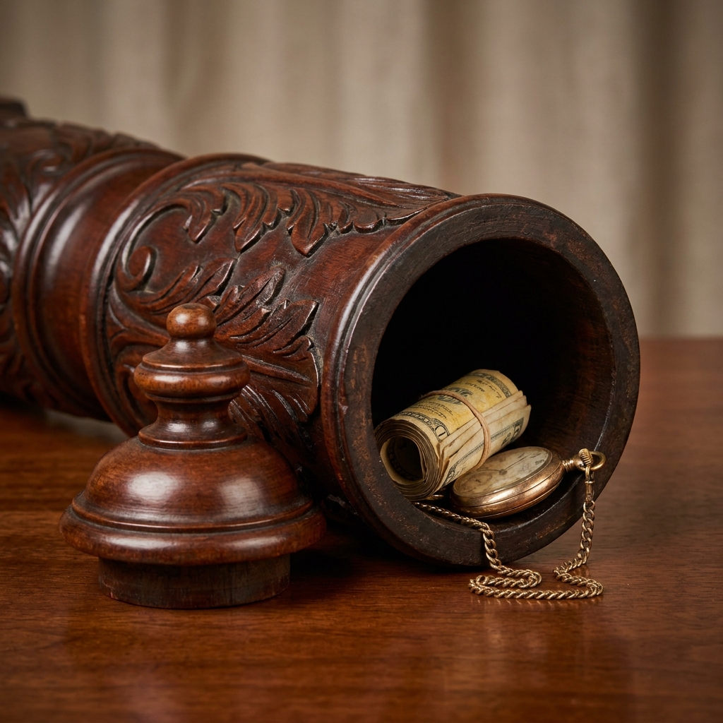 The trick was to insert a thin rod (like a pen nib or a hatpin) into a nearly invisible pinhole on the side of the column and press. The spring would release, and the entire column would slide out like a telescope, revealing a hollow tube stuffed with rolled deeds and family papers.