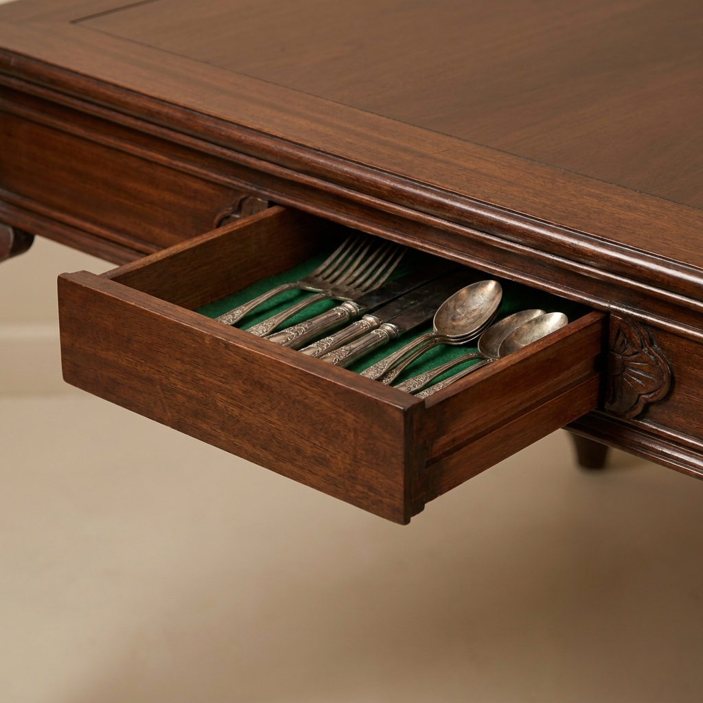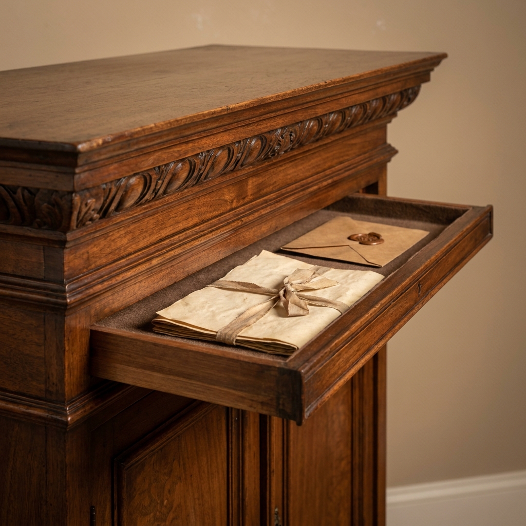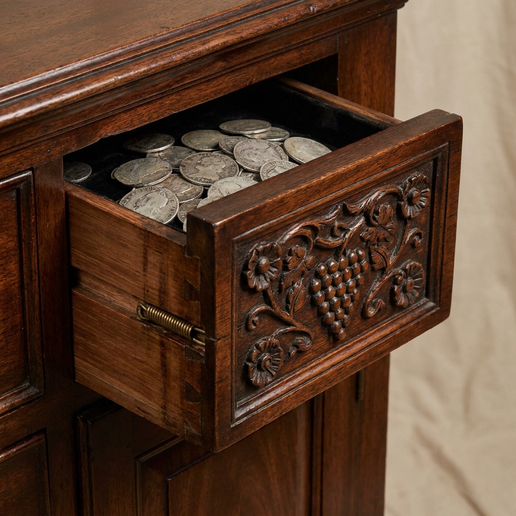 If you pressed on the correct carved rosette with just the right amount of pressure, the panel would pop forward by about an inch. From there, you could pull out a shallow hidden drawer — usually filled with silver coins or small valuables the butler was not supposed to see.