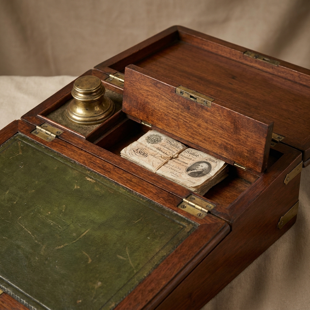 Underneath the inkwell, there might be a hidden mechanism. Sometimes, if you inserted a pen nib into a tiny hole and pressed, a spring-loaded board would fly up, revealing a hidden layer for cash.