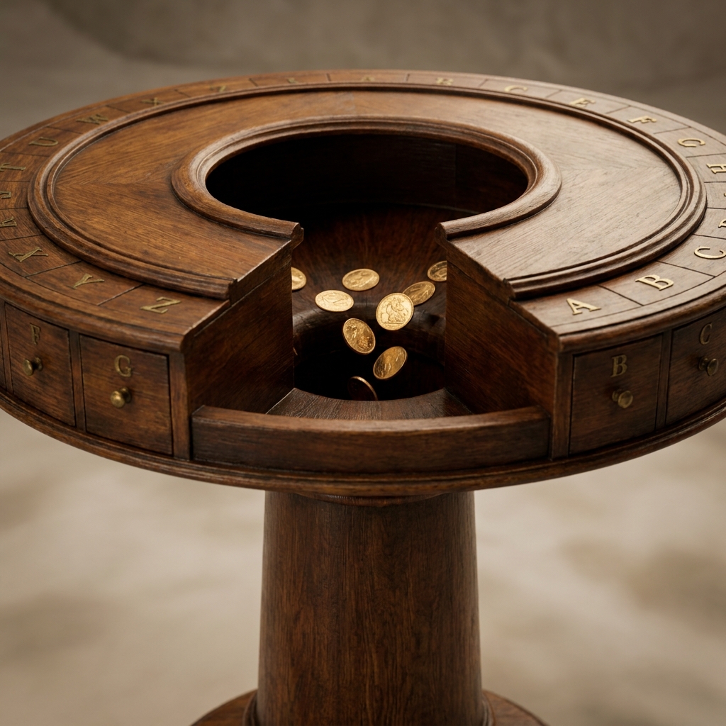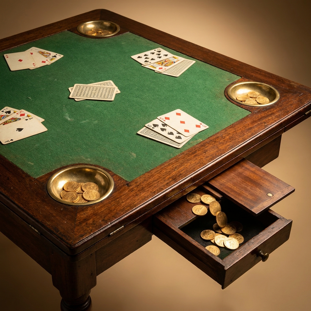 A specialized coin chute allowed the landlord to sweep gold coins directly into the hollow center leg, where they dropped into a locked iron box bolted to the floor.