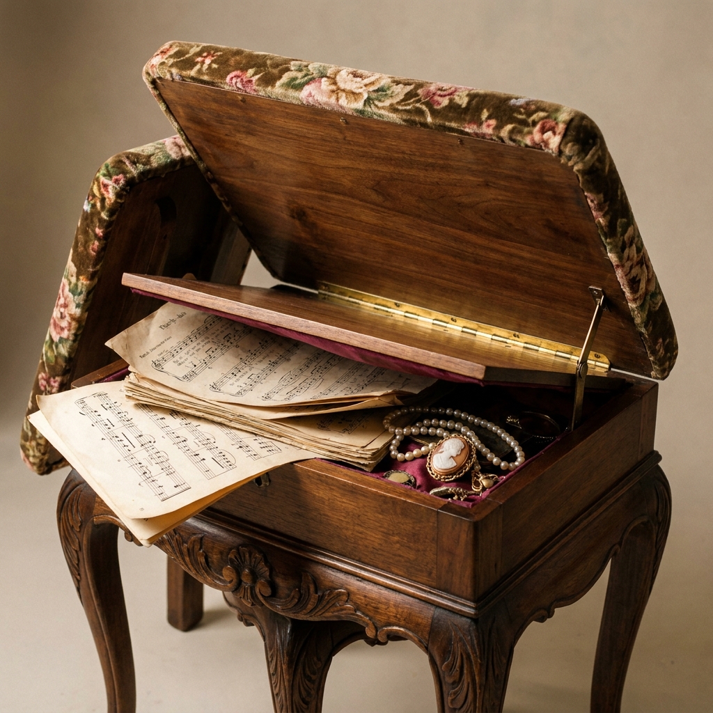 The bench was used to store sheet music. You would lift the padded seat on its hinges, and inside was a felt-lined cavity for your Chopin and your Mozart.