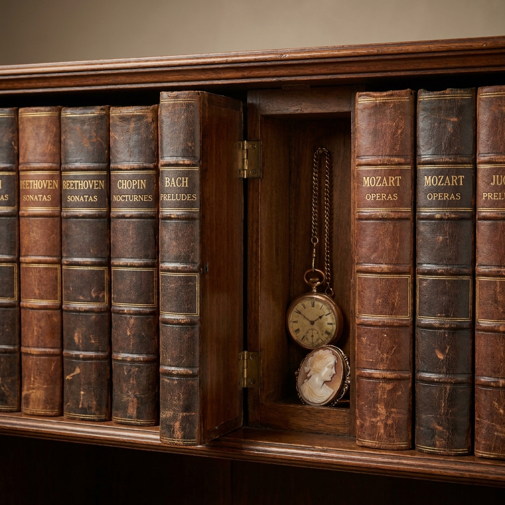It was painted and tooled to look exactly like a leather-bound volume of Beethoven or Liszt. But it was hinged at the side, and if you pulled the spine forward, the whole false “book” swung out like a door.