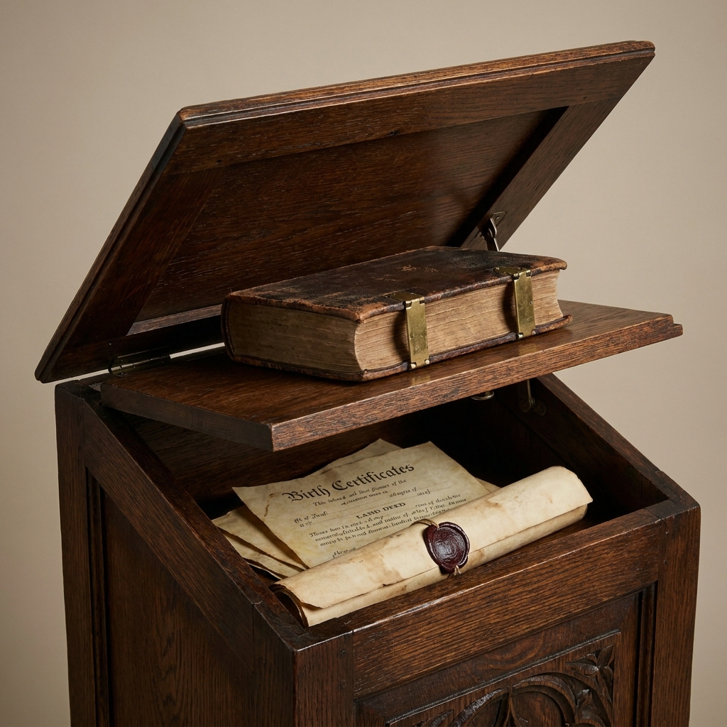 Many Bible Boxes had a “shelf” inside that lifted up to reveal a hidden layer for birth certificates and land grants.