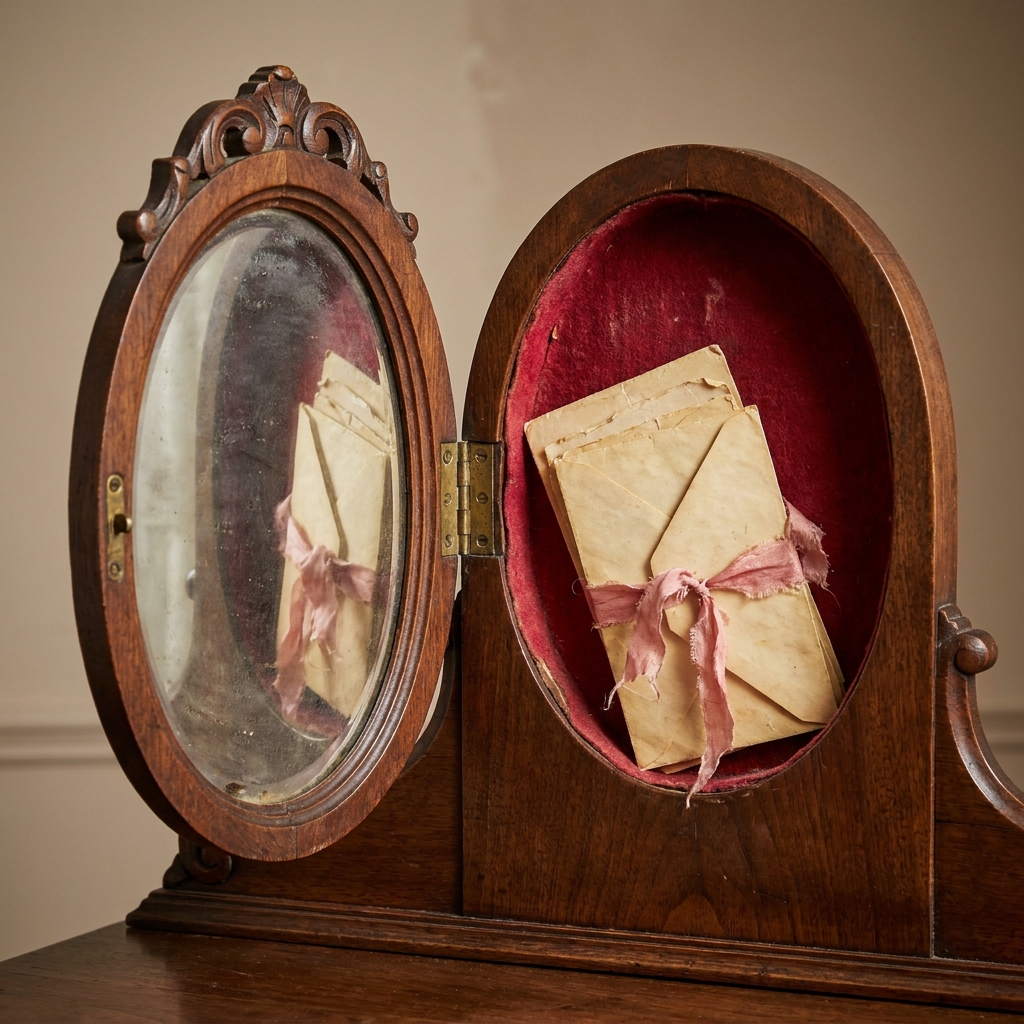 Behind it was a shallow felt-lined recess carved into the wood backing. It was the standard hiding place for love letters that you did not want your spouse to see.