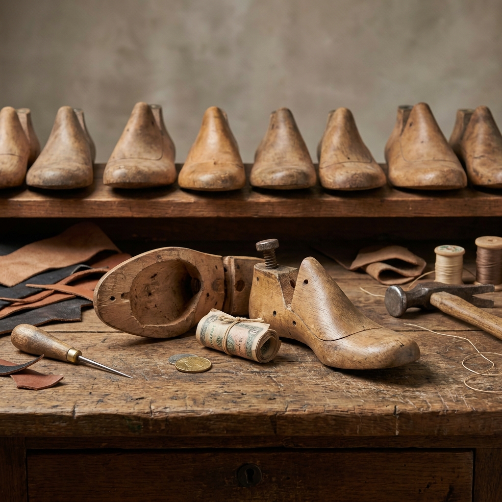 On the bench sat a row of wooden “shoe lasts” — the foot-shaped forms used to stretch and shape leather shoes.
