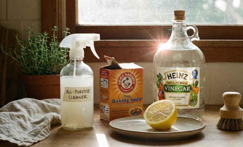 A mixture of vinegar and water cleaned the windows better than Windex ever could. Baking soda scrubbed the sink.