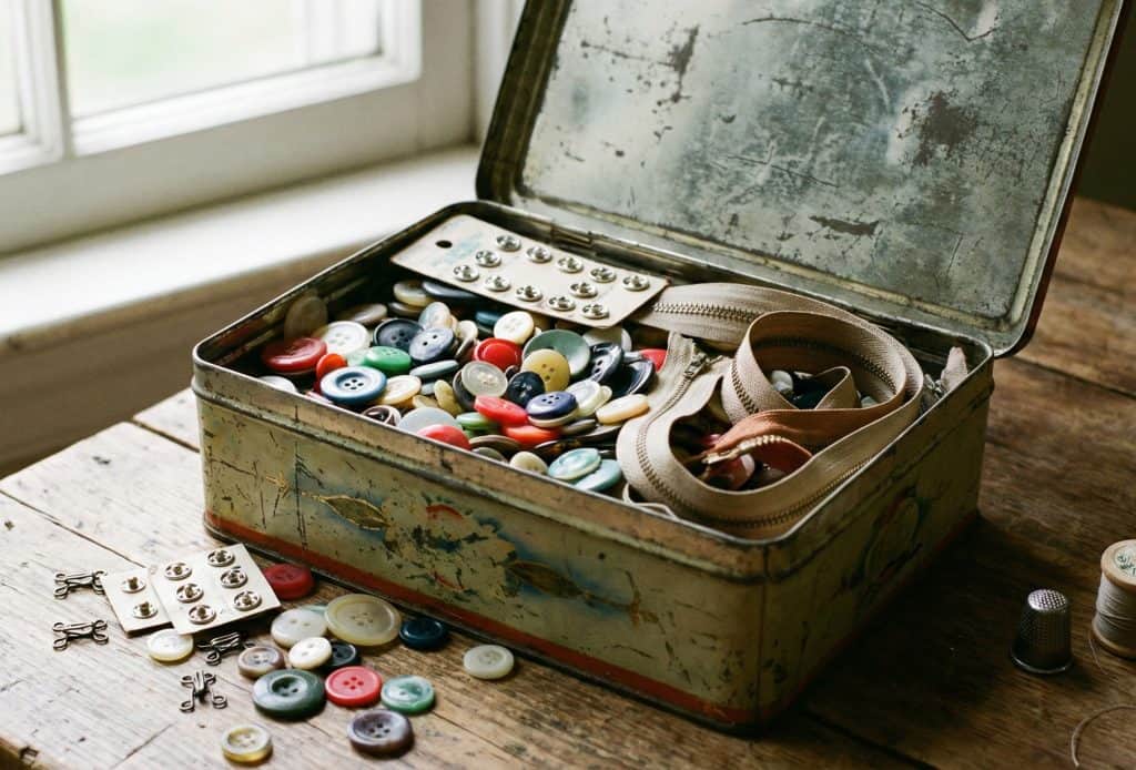 Zippers, snaps, and hooks were harvested and stored in a tin.